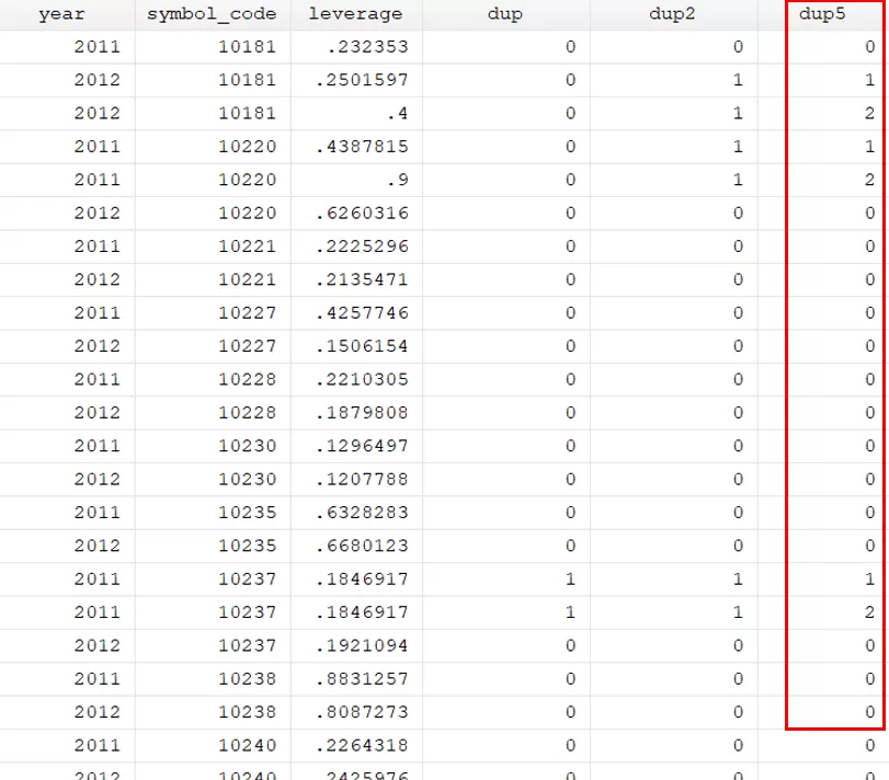 After running, this command the new variable will be generated named dup. This variable contains binary observation. 1 will represent the duplicate observation and 0 otherwise. However, the above command has an error, it does not specify duplicate observations across symbol_code and years. Therefore, to overcome that below command will be used.