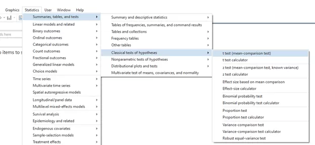 Statistics > Summaries, tables and tests > Classical tests of hypotheses > t-test (mean comparison test)
