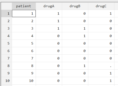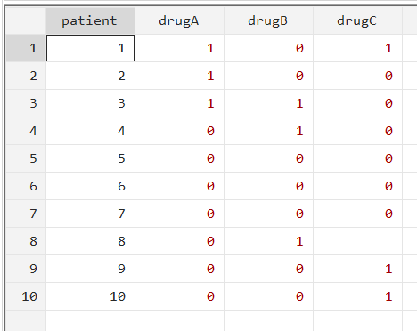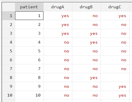 Suppose we have a dataset on patients and the drugs they have been administered. If drugA is administered to a patient, the variable shows ‘yes’, if not, it shows a ‘no’. The following image depicts what the data looks like: