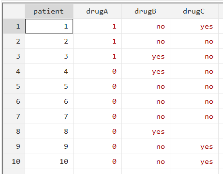 Note, that 0 and 1 are enclosed in inverted commas since the type of all three drug variables is a string for now. The command above will change the drugA variable as follows: