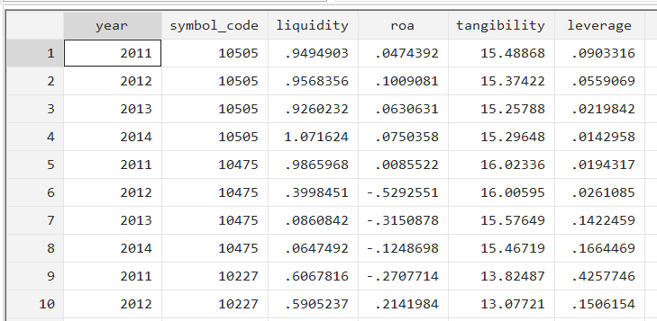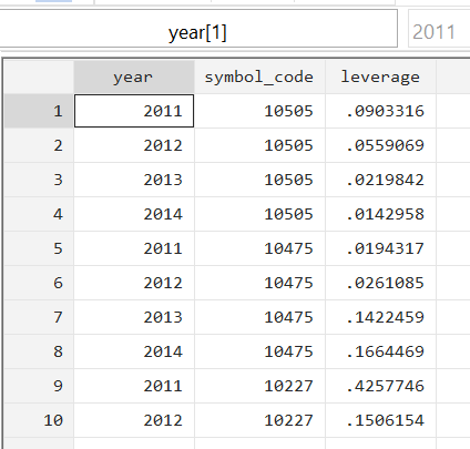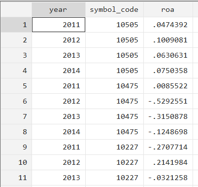 Let’s suppose that alongside the leverage dataset, we now have a dataset on ROA (Return on Assets) for various years for each firm, and the two need to be merged together. The type of merge, and the key variable will now vary in this case. In both the master and the using file, each observation is unique to one particular firm in one particular year i.e., the key variable in both files is a combination of the firm (identified by the ‘symbol_code’ variable) and year.