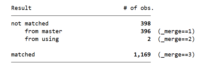 The last result in this output table shows us that 1,169 observations matched from the master data with the using data. For these observations, the _merge variable equals 3.
