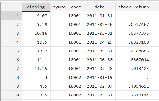 In our final example, let’s merge two datasets, one of which is monthly data on stock returns, and the other one is the same annual balance sheet data on ROA and leverage which we have used previously. The images below show a snippet of the monthly data on stock return and the yearly balance sheet data.