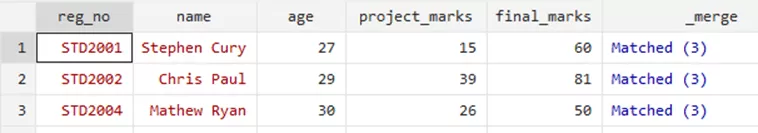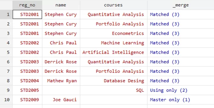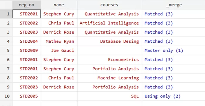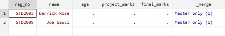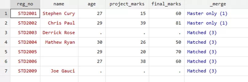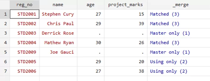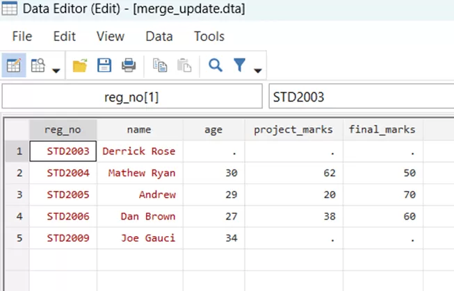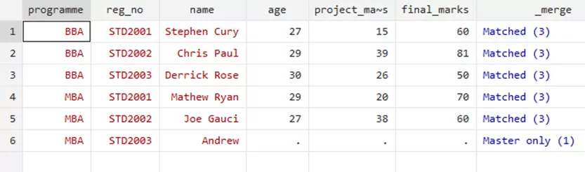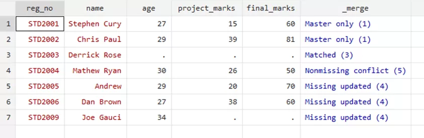 Through the merge variable, you can see that the three rows where the update took place. This option filled the missing values for relevant students. However, the ‘Nonmissing conflict’ suggests and warns that there was a conflict that has not been resolved, i.e, the updated marks of Mathew Ryan were not included in this update as it would require a replacement to the previous marks.