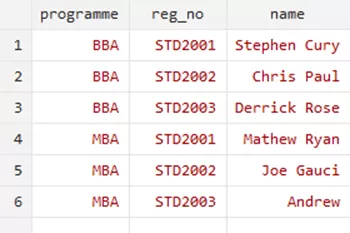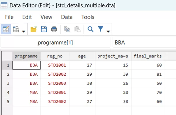 In situations where a single key variable isn’t sufficient to uniquely identify records, we can perform a merge using multiple key variables. Let us illustrate this with an example involving program and registration numbers. Our dataset ‘std_names_multiple.dta’ has repeated registration numbers corresponding to their programmes, as it can be seen in the illustration below,