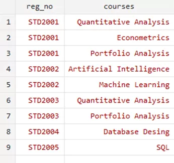 A many to one merge is needed when there are multiple instances of a key variable in the master file and only one in the using file. We’ll explore this scenario and show how to merge data accordingly. Let us see the master file for this example; ‘student_courses.dta’ file where registration numbers and the courses registered constitute the file.