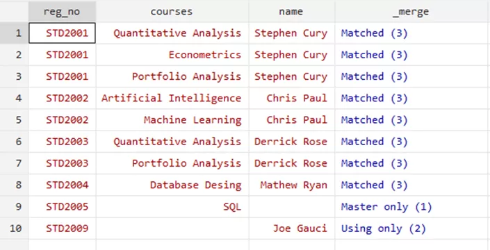 Upon closer examination, you can observe that one student may have registered two or more courses that result in repetition of the registration numbers. Knowing this, we can not perform the one to one merge with this command,