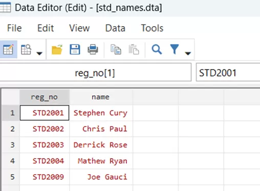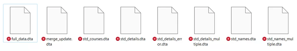 Let us assume that we have a file titled ‘std_details_error.dta’. Additionally, we want to merge this file with our master file ‘std_names.dta’. As we have done this simple merging already, we will be going through these commands,