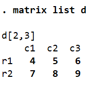 This command tells Stata to display the value in the first row and third column of matrix ‘d’.