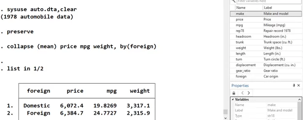 sysuse auto.dta,clear preserve collapse (mean) price mpg weight, by(foreign) list in 1/2