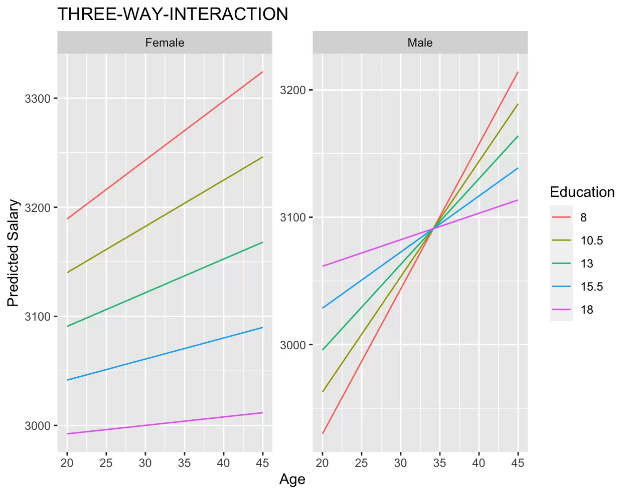 In this comprehensive series, we assessed the impact of categorical and continuous variables on predicting salary levels. Furthermore, we have explored, how the relationship between variables can be influenced by different interactions by presenting both graphical and tabular representations of our models. In this part have seen how three variables collectively play the role of moderation in our model.