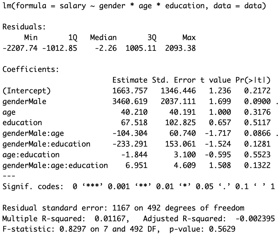 three_way_model <- lm (salary ~ education * gender * age , data = data) summary(three_way_model)