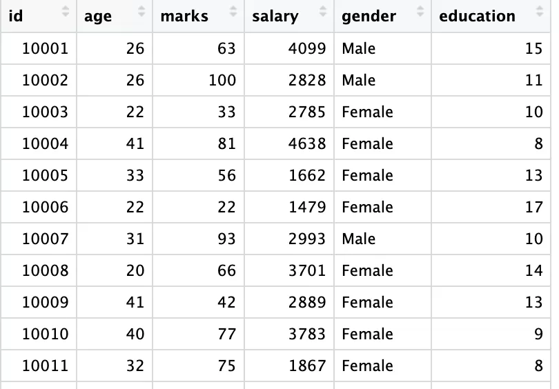 set.seed(123) data <- data.frame(id = 10001:10500, age = sample(20:45, 500, replace = TRUE), marks = sample(20:100, 500, replace = TRUE), salary = sample(1000:5000, 500, replace = TRUE), gender = sample(c('Male', 'Female'), 500, replace = TRUE), education = sample (8:18, 500, replace = TRUE))