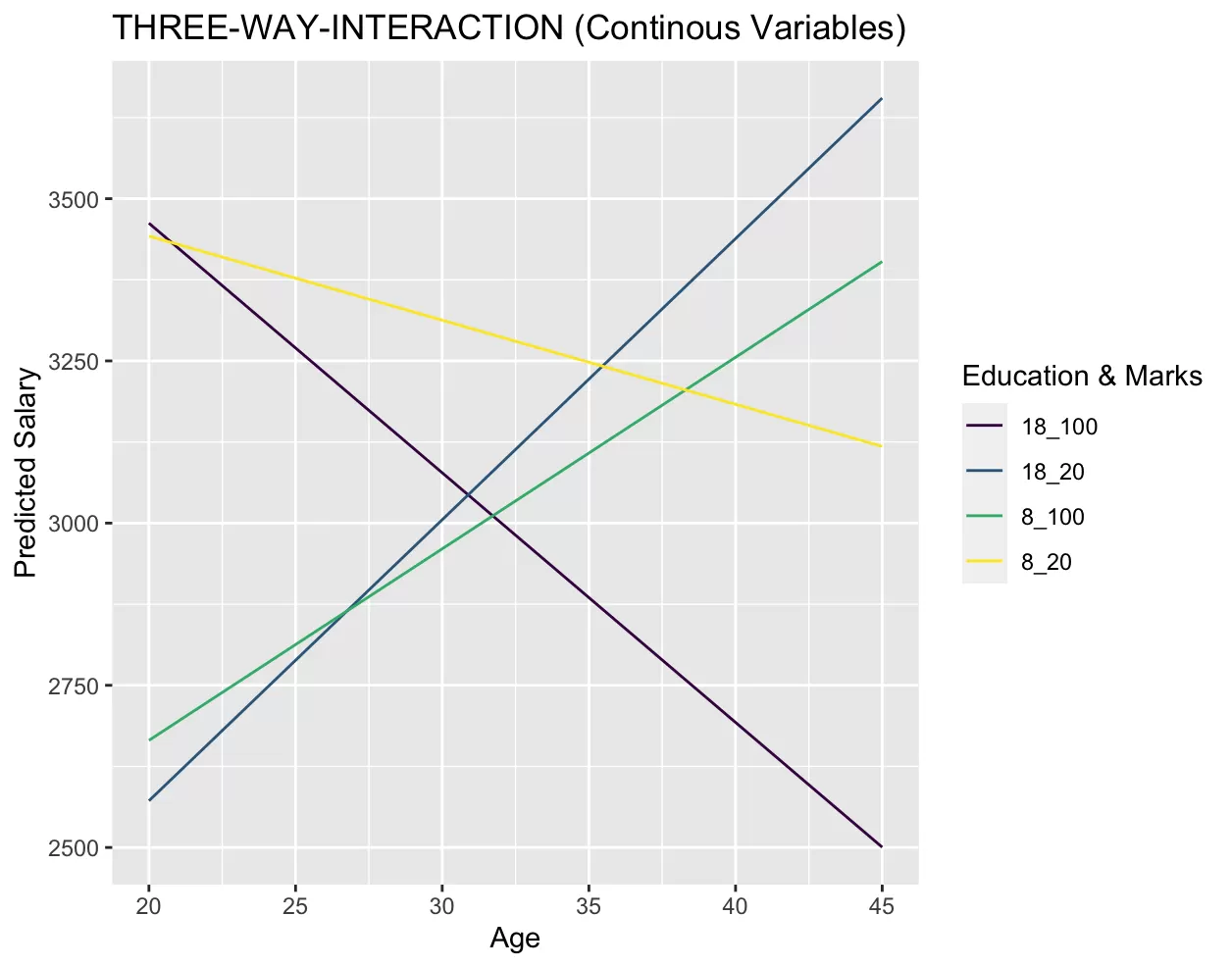 age_intervals <- seq(min(data$age), max(data$age), length.out = 2) education_intervals <- seq(min(data$education), max(data$education), length.out = 2) marks_intervals <- seq(min(data$marks), max(data$marks), length.out = 2) predicted_salaries <- expand.grid(age = age_intervals, education = education_intervals, marks = marks_intervals) predicted_salaries$predicted_salary <- predict(cont_three_way_model, newdata = predicted_salaries) predicted_salaries$combined <- paste(predicted_salaries$education, predicted_salaries$marks, sep = "_")