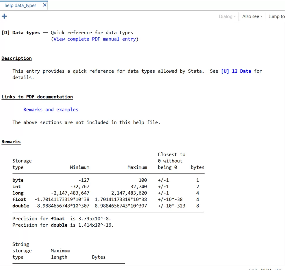 First up, we have integers. Stata classifies integers into three categories, namely, byte, integer, and long. Each type of integer can accommodate a specific and distinct range of integer values. For example, a byte can store values from -127 to 100, while an integer may hold values within a more extensive range i.e. -32,767 to 32,740.